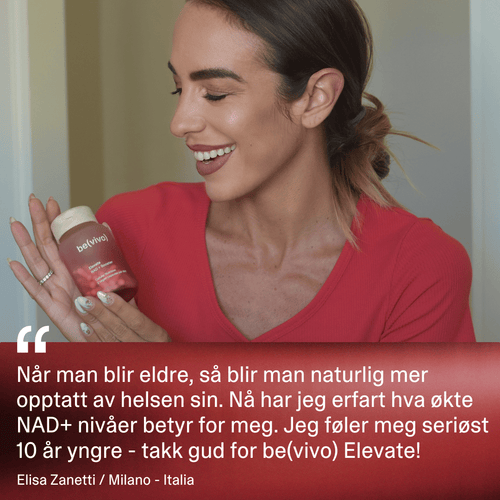 "Nå tar jeg Bevivo Elevate hver dag fordi jeg vet at NAD+ fører til både energi og vitalitet i hverdagen.